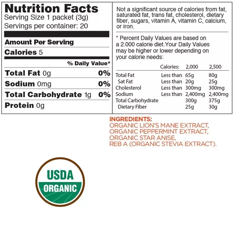 Each box of Lion’s Mane Elixir contains 20 powder packets. To use it, simply add one packet to 8 fluid ounces of hot water or blend it into your favorite smoothie. Drink it when studying, reading, or writing, or simply when you need a brain boost. Drink one packet per day.